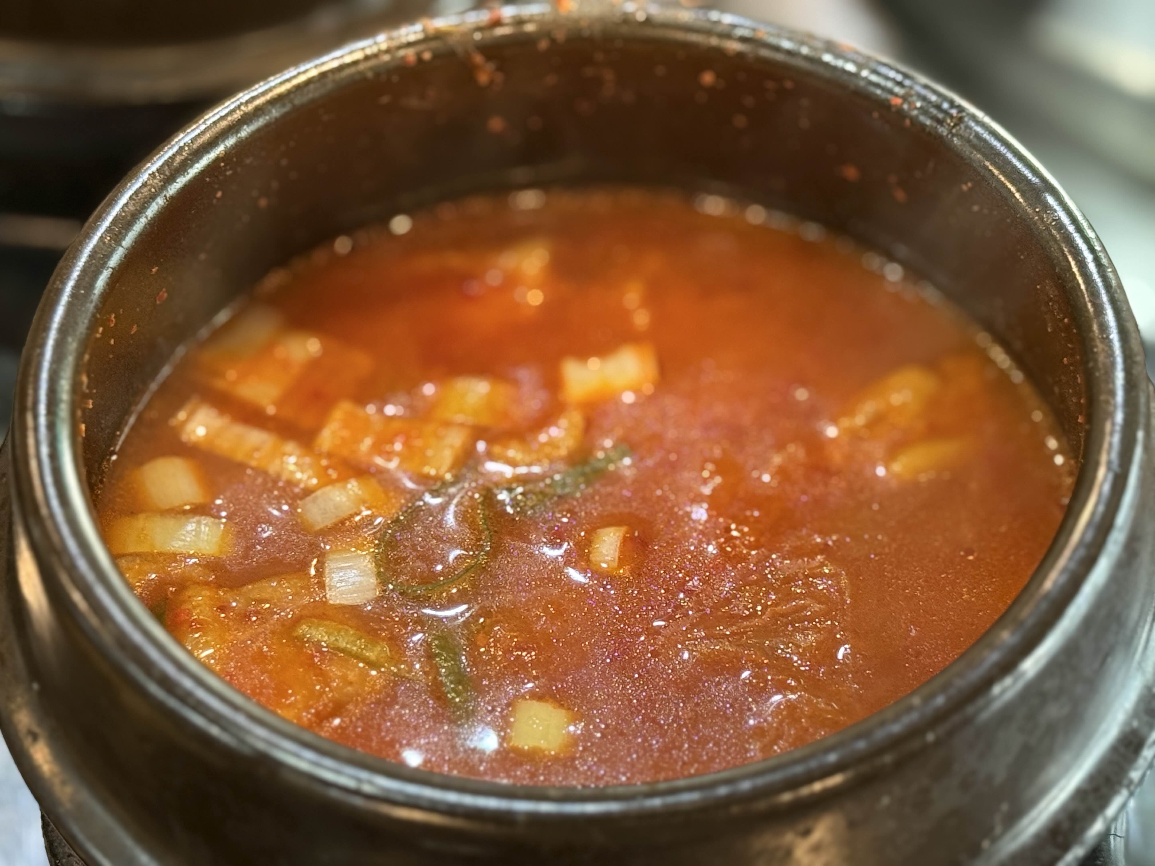 찌개에 애호박, 두북, 버섯, 고기 등 재료가 풍부하게 들어가 있었고